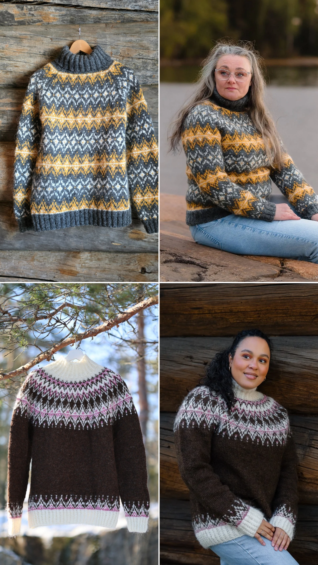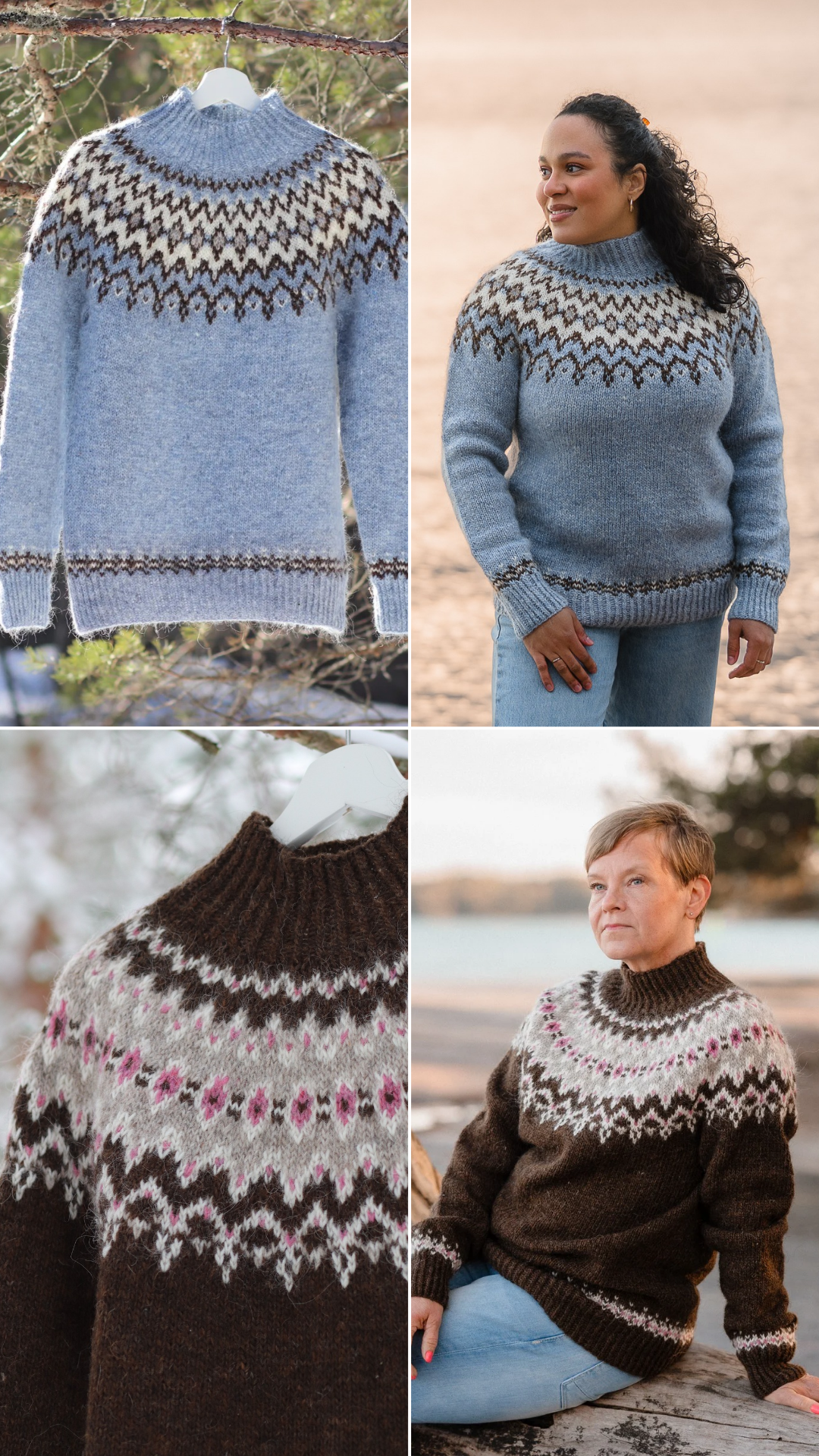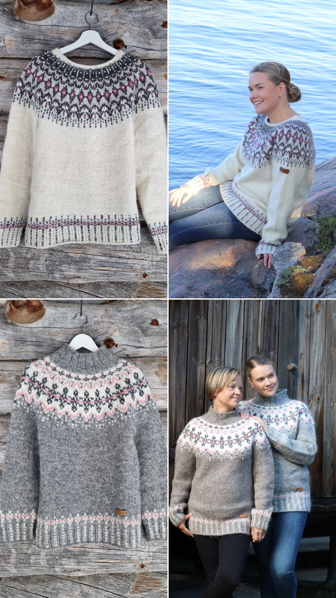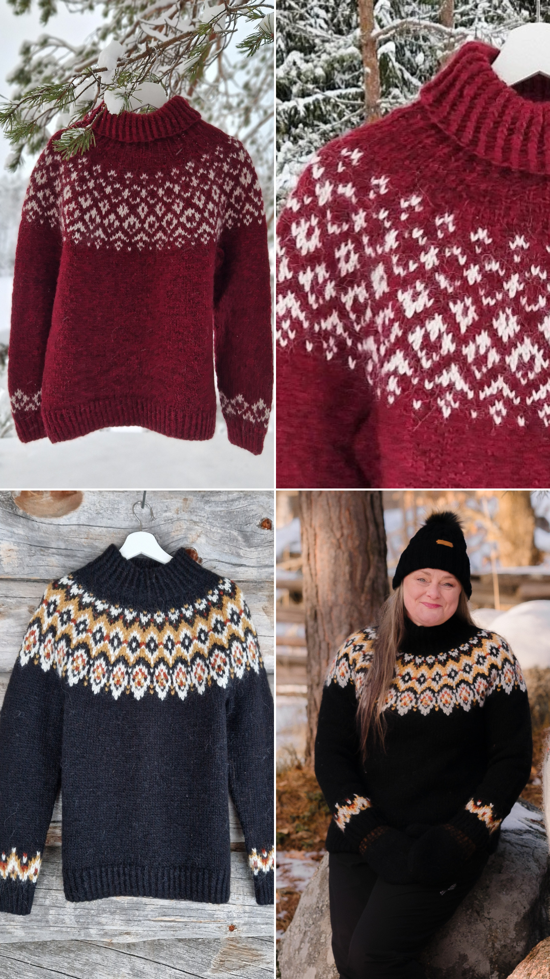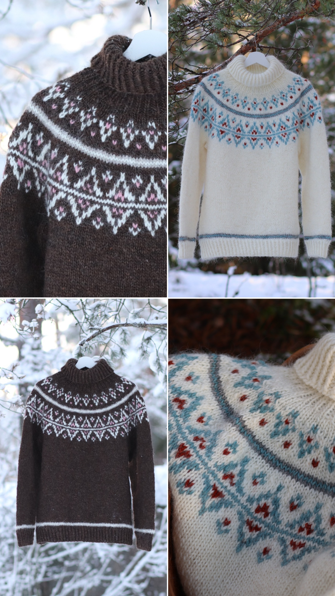 Kaikka neuleet neulotta Alafosslopi tai Lettlopi langoista. Neuleet uusia ja käyttämättömiä.