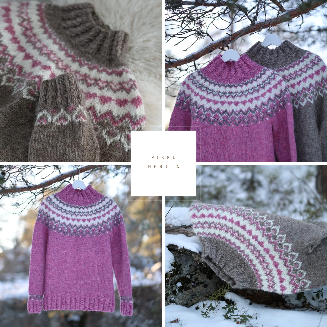 The name of the Hertta knit already tells you that it is a heart knit. Little Hertta is a thinner version of the heart family and the yarn used in the knit is Lettlopi.