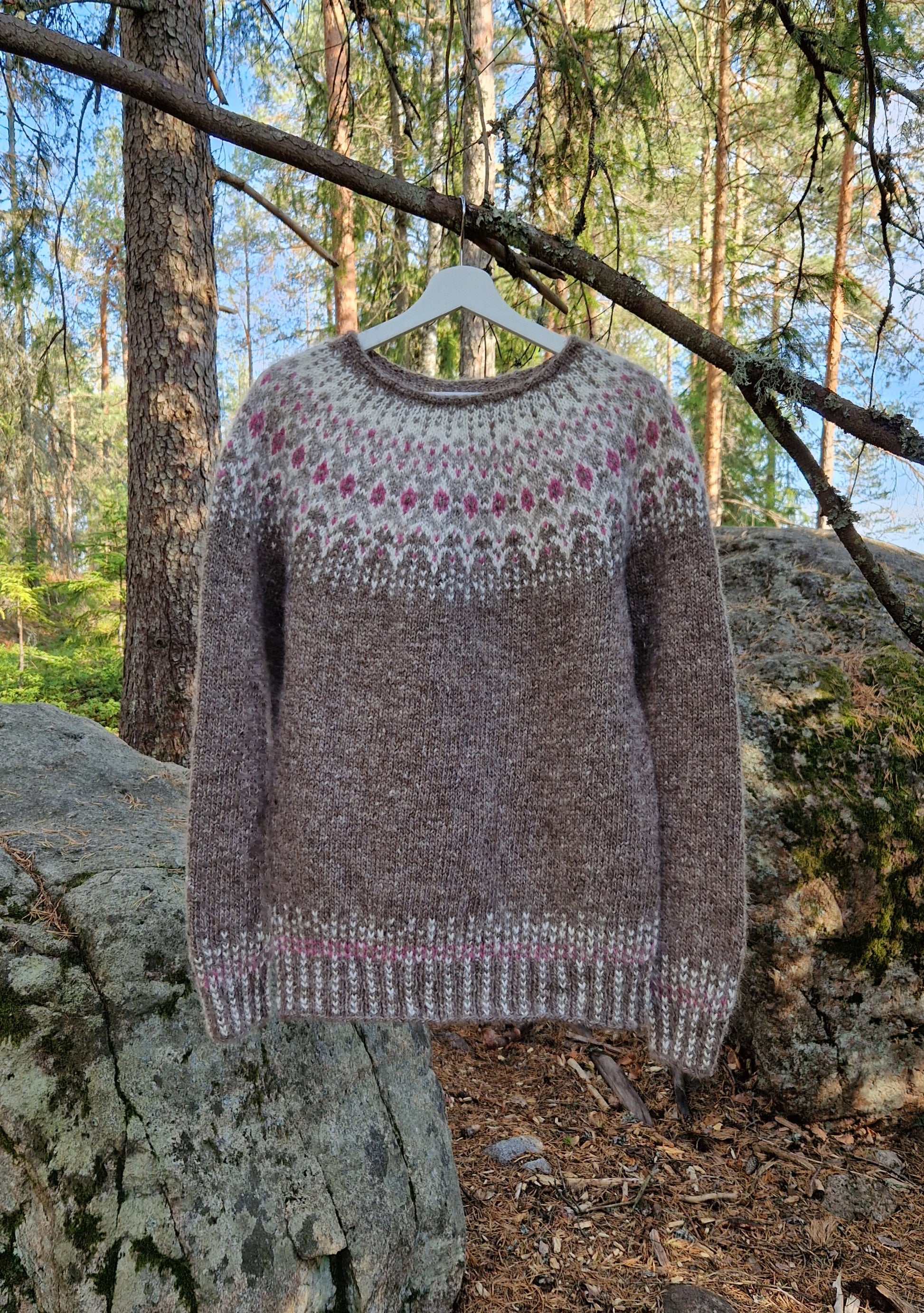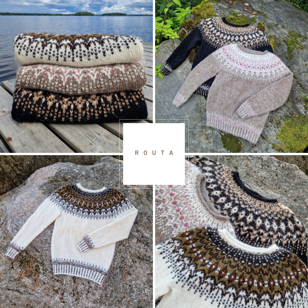 ROUTA neule syntyi fiiliksestä tehdä neule ilman suunnitelmaa. Vaihe vaiheelta tuli ideat, kun neulos eteni. Lopputulos yllätti itsenikin miten upea neuleesta tuli. Malli käy miehille ja naisille. Jos haluaa miehisyyttä enemmän jättää hihasta ja helmasta kuvion pois :)