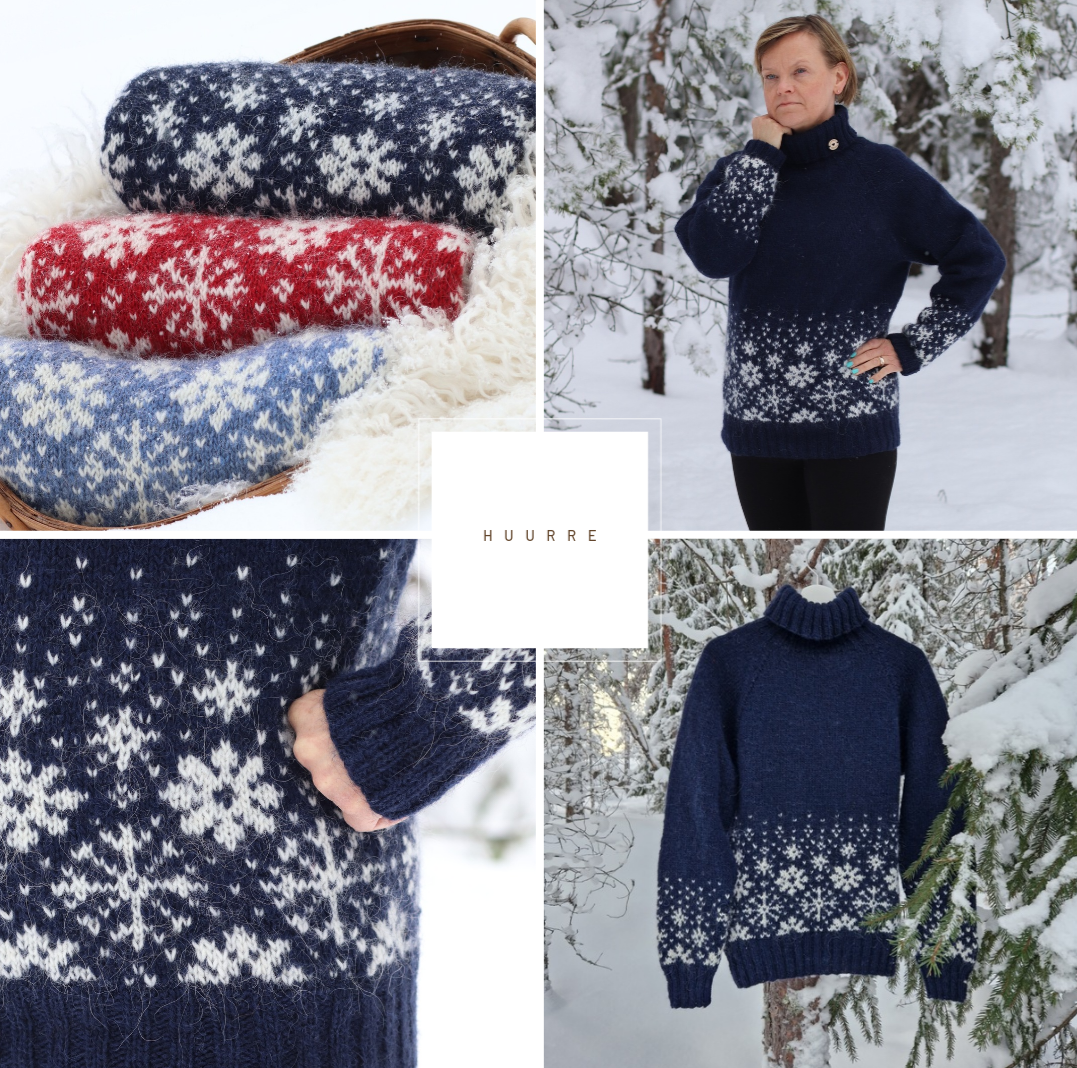 HUURTEEN ajatus lähti tehdä talviaiheinen neule, jossa lumihiutaleet leijailee kevyesti neuleen alaosassa ja hihoissa. Raglakavennus tekee, että neule istuu kauniistä päällä ja näyttää hyvältä.