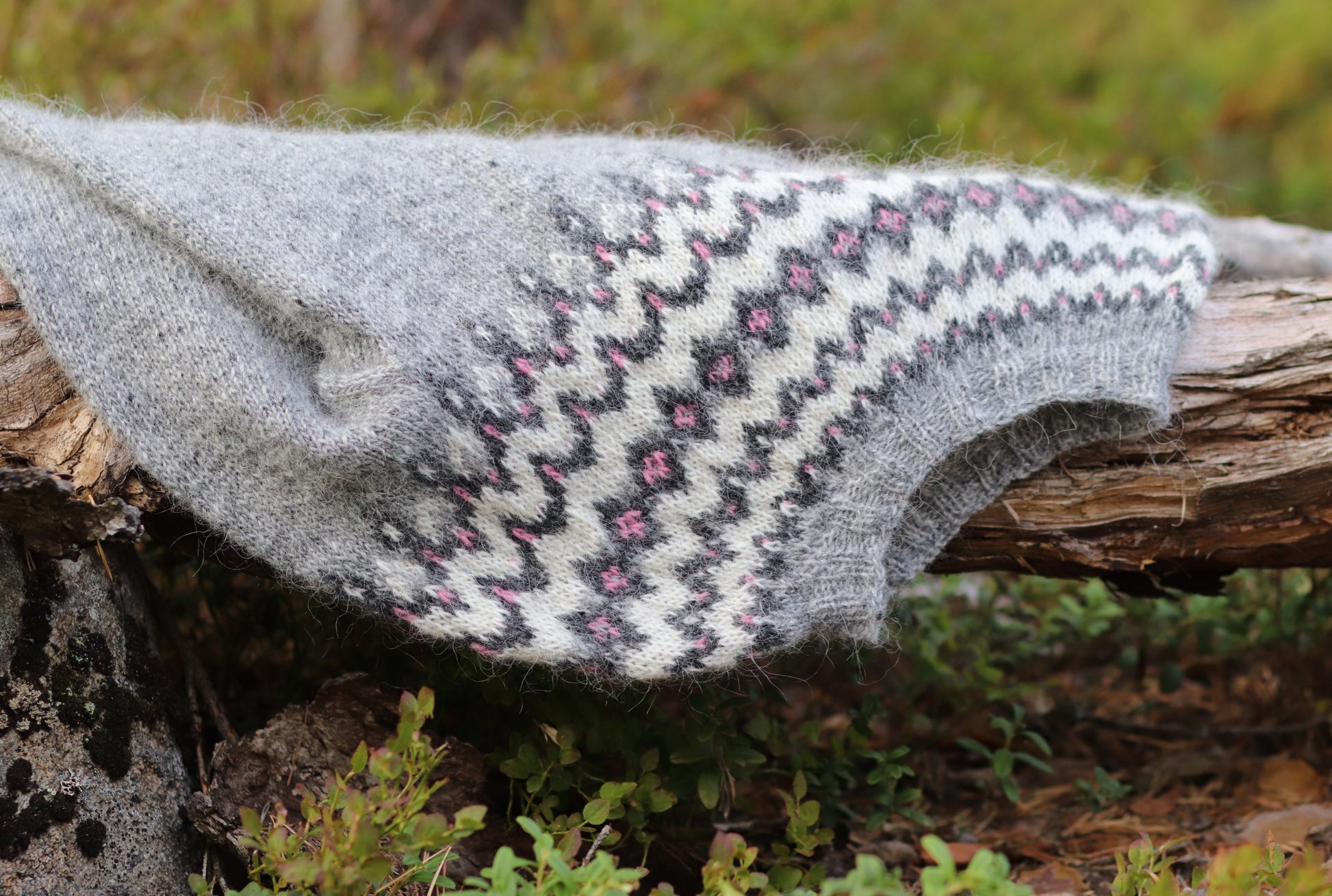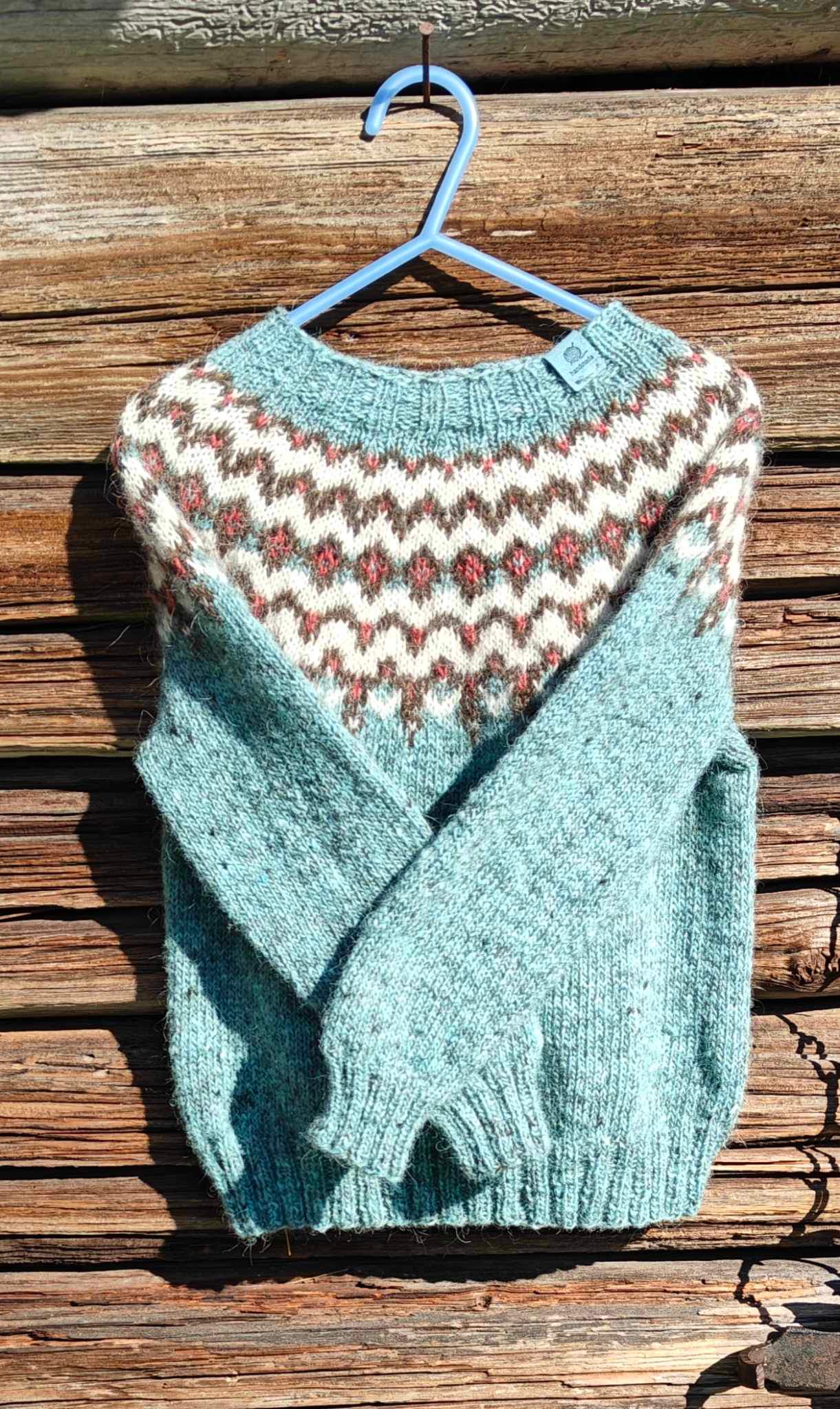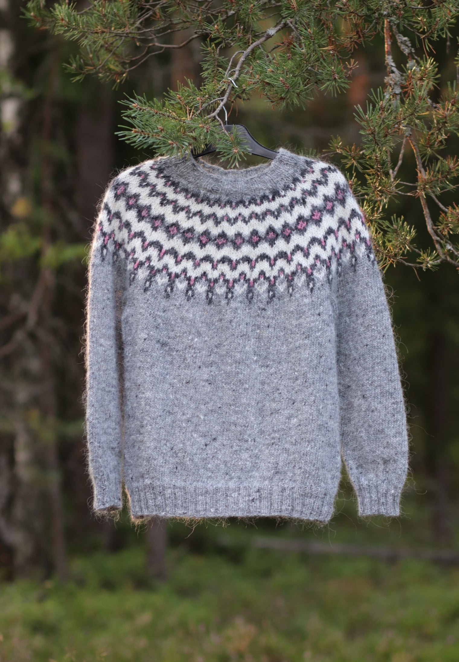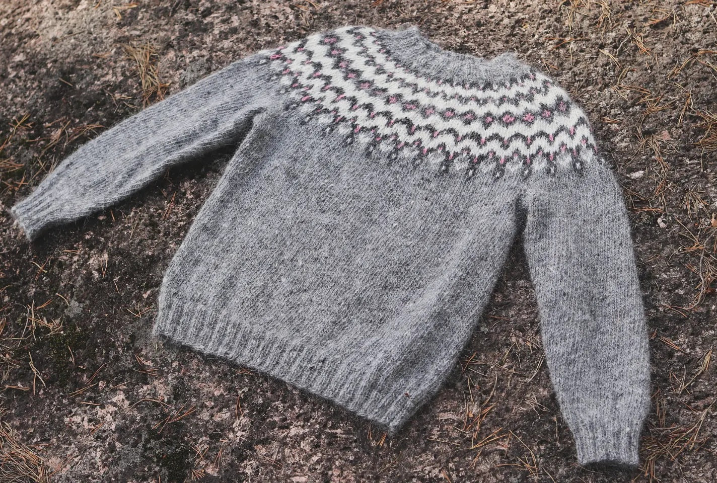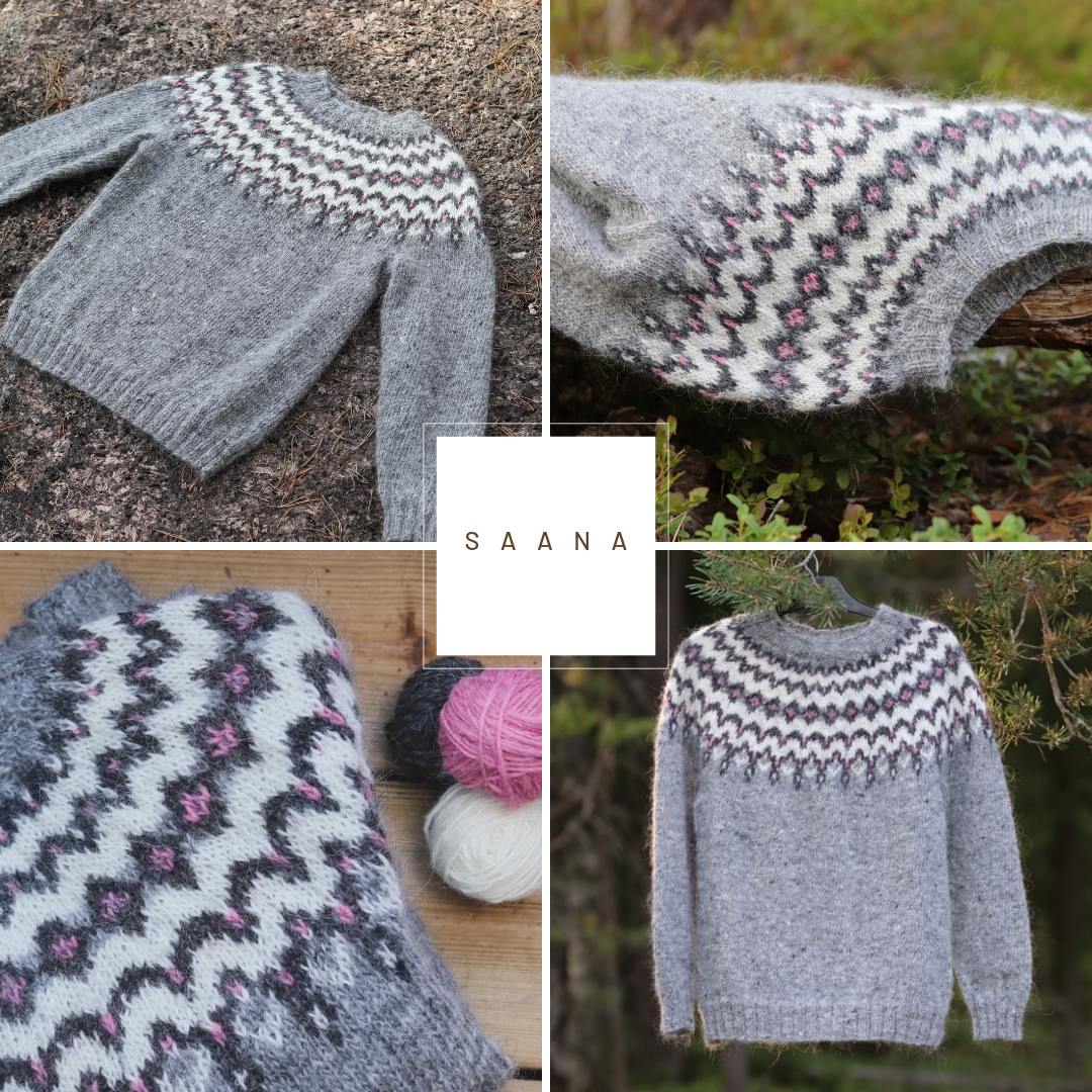 Mallin idealähteenä ovat aikuisten Kanerva ja Calluna neulemallit, ja langaksi valitsin Istexin uutuus langan Fjallalopi. Valmiista neuleesta tulee kevyt ja ilmava, ja se sopii myös sisällä pidettäväksi neuleeksi.