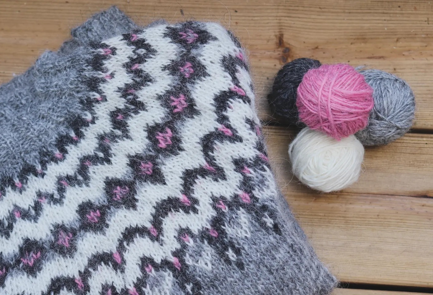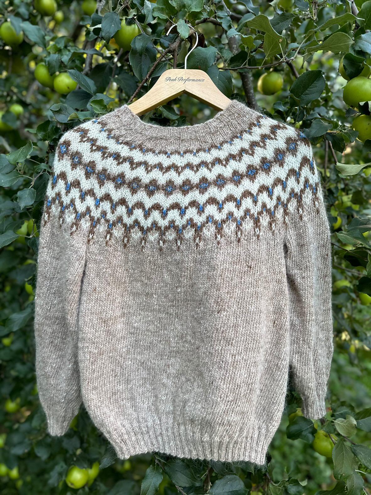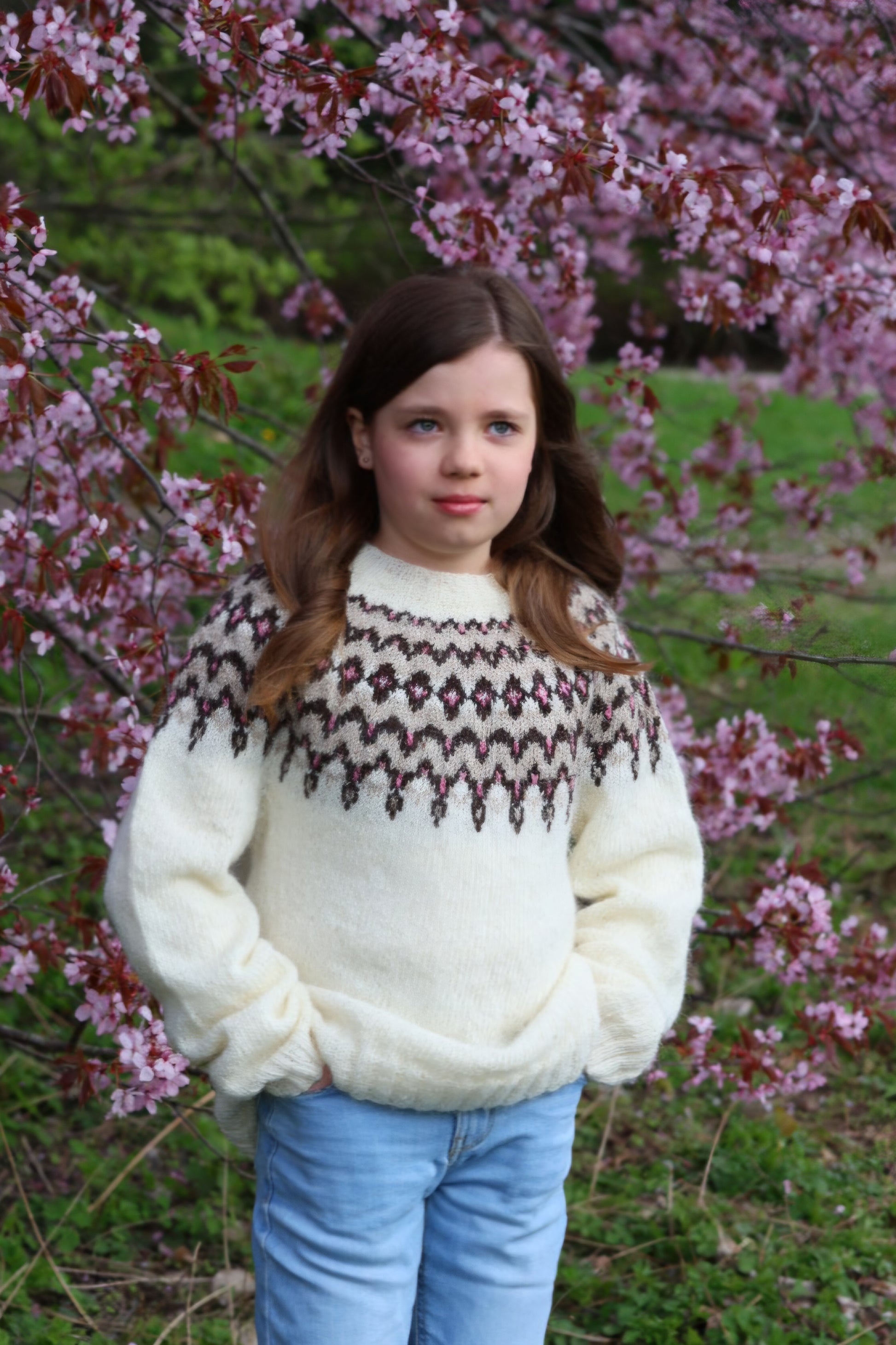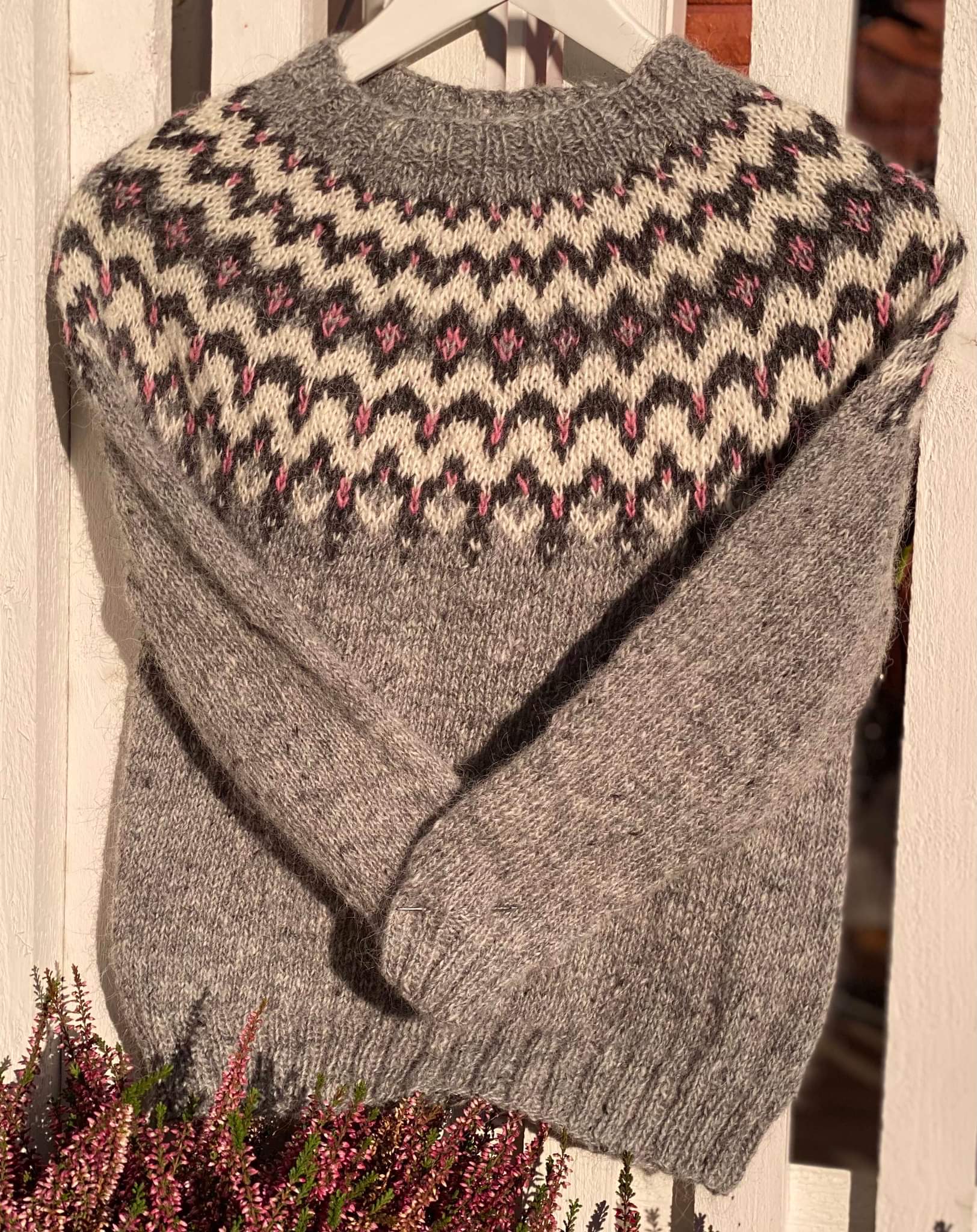 Mallin idealähteenä ovat aikuisten Kanerva ja Calluna neulemallit, ja langaksi valitsin Istexin uutuus langan Fjallalopi. Valmiista neuleesta tulee kevyt ja ilmava, ja se sopii myös sisällä pidettäväksi neuleeksi.