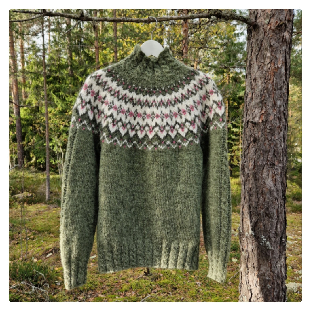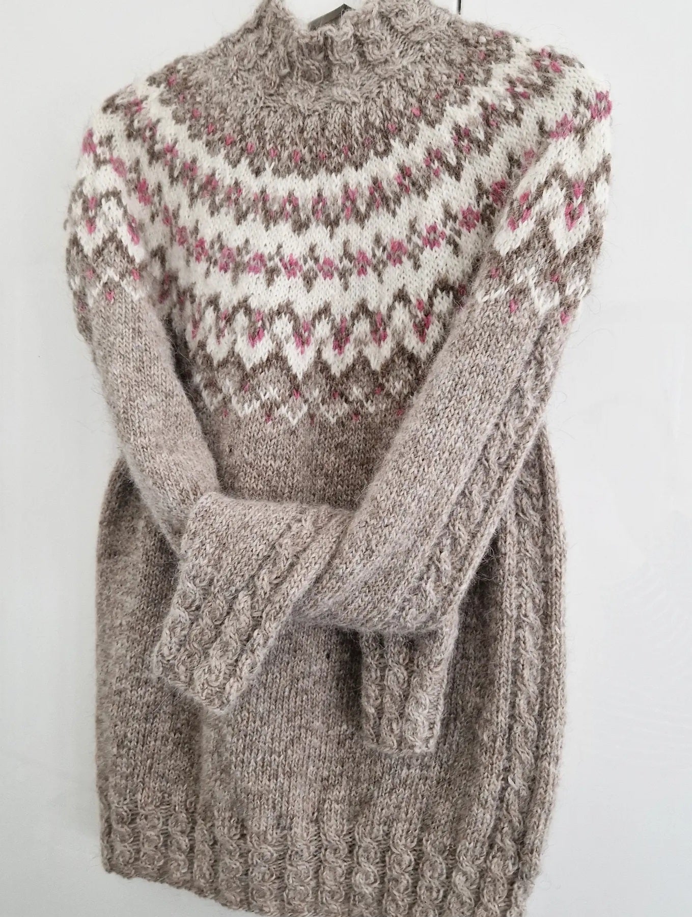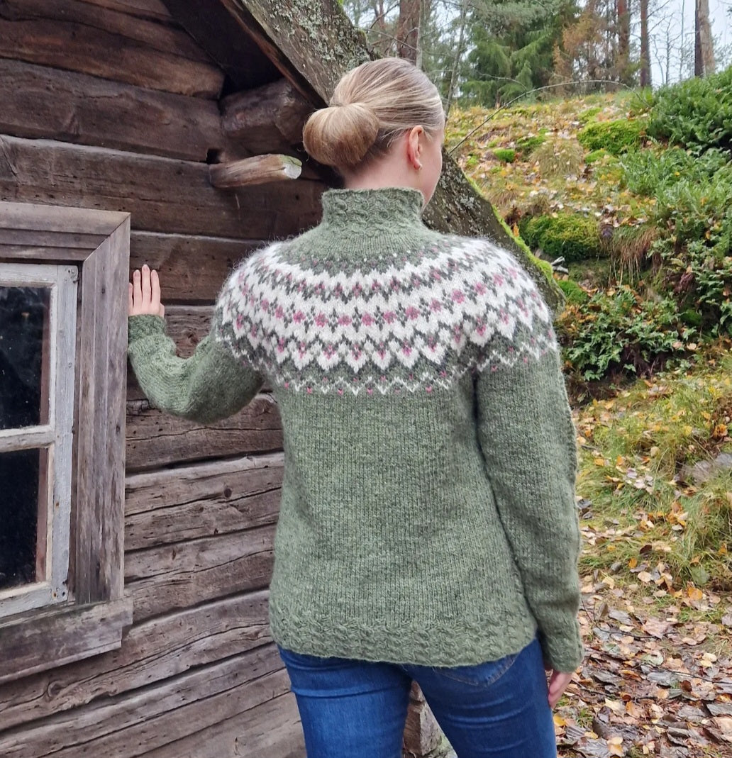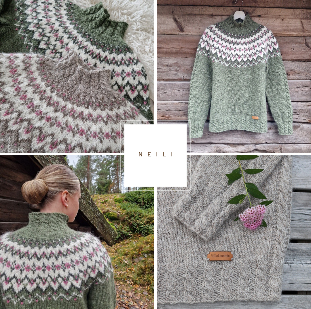 NEILI neuleessä yhdistyy kirjoneule ja palmikot. Siksi neule on täynnä ihania yksityiskohtia, jotka tekee neuleesta todella kauniin. Palmikot jatkuvat kauniisti alhaalta helman ja hihojen palmikkojoustinneuleesta ylös kainaloon ja kirjoneuleeseen saakka. Kirjoneule on herkkä ja ilmava. Neili neulotaan aidosta 100% Islantilaisesta villalangasta. (Lettlopi)