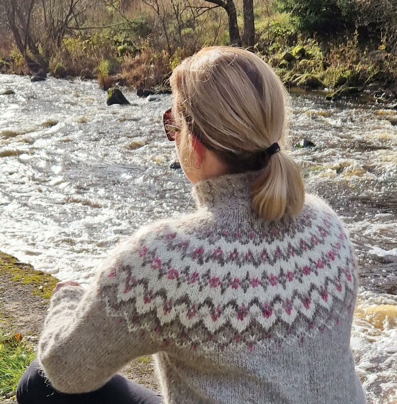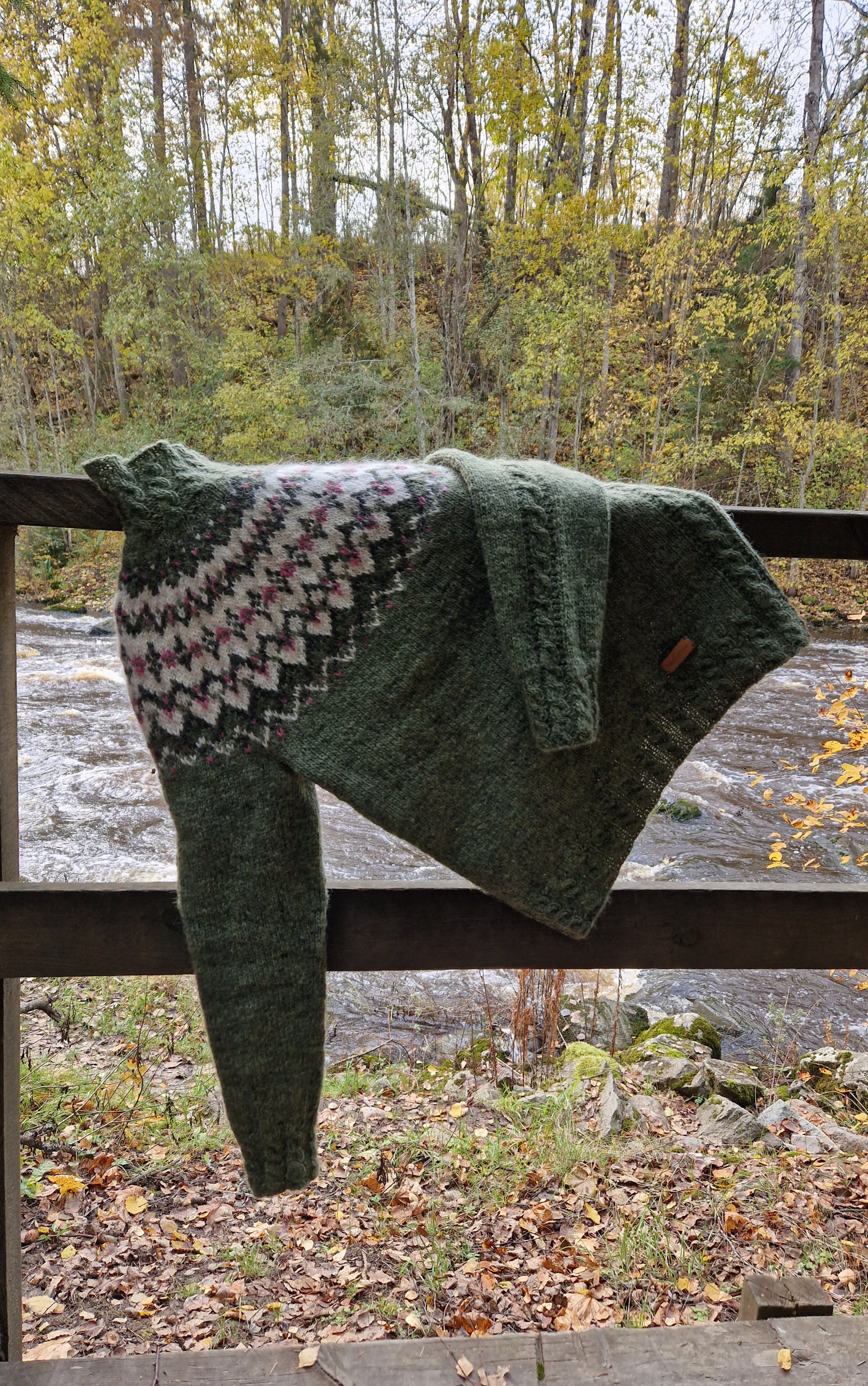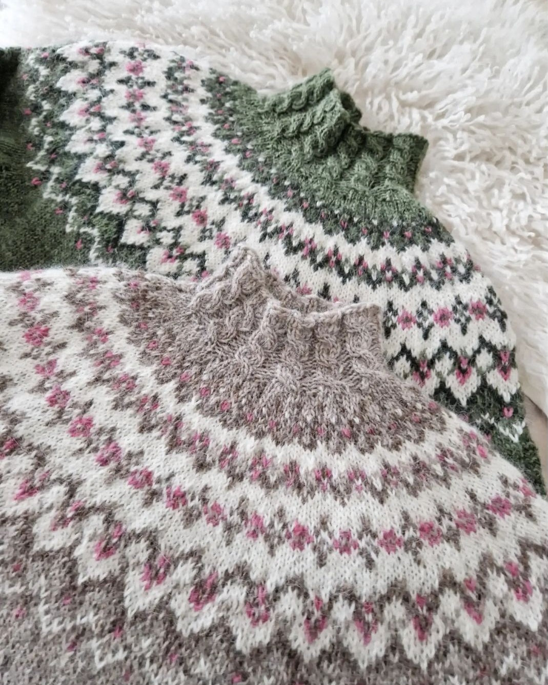 NEILI neuleessä yhdistyy kirjoneule ja palmikot. Siksi neule on täynnä ihania yksityiskohtia, jotka tekee neuleesta todella kauniin. Palmikot jatkuvat kauniisti alhaalta helman ja hihojen palmikkojoustinneuleesta ylös kainaloon ja kirjoneuleeseen saakka. Kirjoneule on herkkä ja ilmava. Neili neulotaan aidosta 100% Islantilaisesta villalangasta. (Lettlopi)
